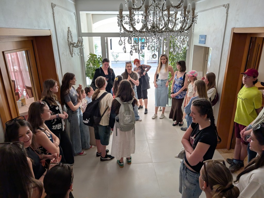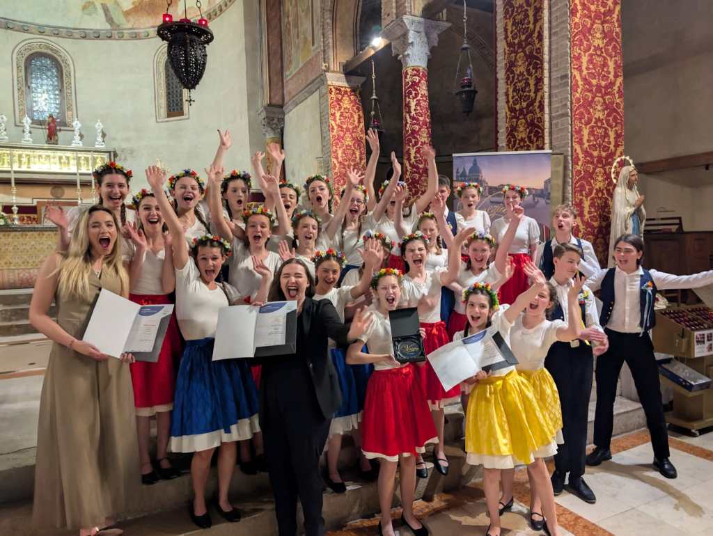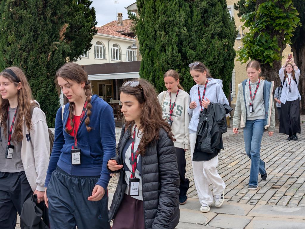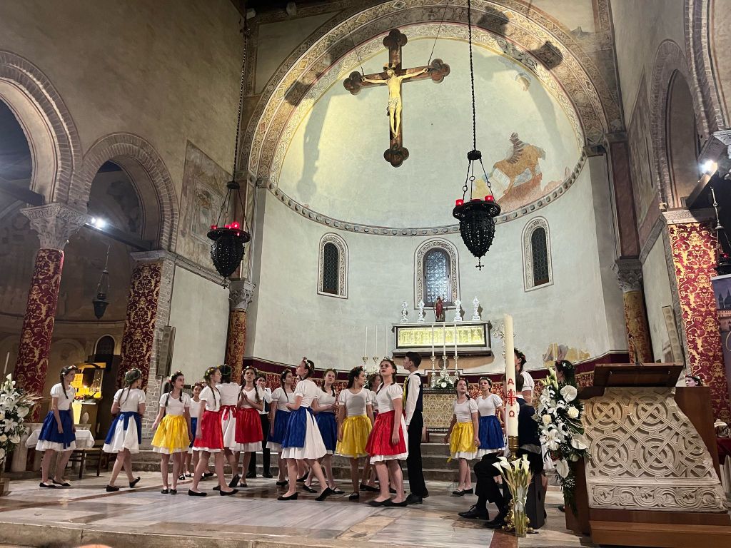 Probudili jsme se do krásného italského rána zalitého sluncem se zvuky moře. Dole nás čekala bohatá snídaně, kde jsme si mohli vybrat mezi italskými salámy, sýry, míchanými vajíčky, zeleninou, dokonce jsme mohli ochutnat italské snídaňové mini dezerty – i přesto někteří zvolili čokoládové bobky s mlékem. Na hotelu se děti rozezpívaly a vydaly se na workshop s porotci festivalové soutěže. Sbor zazpíval porotě celý svůj dnešní program v dětské kategorii “jako na soutěži”. I když to nebyl náš nejlepší výkon (všichni víme, že to umíme lépe), porotci náš i tak velmi pochválili, speciálně za výraz a vyzdvihli naši Rosu Štullić, která podle nich krásně zpívala očima. O speciální potlesk poprosili pro naši paní klavíristku (my víme, že je nejlepší!) a pro pánskou sekci jako oporu spodních hlasů a barvu! Uznali, že ač jde o velmi náročný program pro věkovou kategorii našeho sboru, vypořádali jsme se s ním velmi dobře. Měli pro nás doporučení, která se dala ještě před soutěží aplikovat. Některá doporučení nám i prakticky ukázali a pracovali s námi přímo na místě. Po workshopu měly děti obědové osobní volno venku poblíž pláže a po něm sraz na hotelu, kde jsme si znovu zopakovali doporučení porotců a poté už nás čekala akustická zkouška v prostorách soutěže (v kostele), ostrých 10 minut pro každý sbor včetně příchodu a odchodu. Vystupovali jsme až na konci celého bloku, měli jsme tedy čas (hlavně mladší děvčata) se sžít s novými sukněmi, které byly pro tento výlet ušité. Všechny nám během toho zkoušejícího procesu umělecky vyrostly, adekvátně k tomu tedy mají nový kostým. A všichni krásně ladíme!