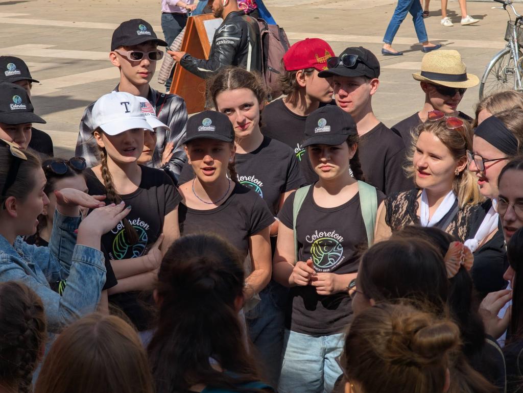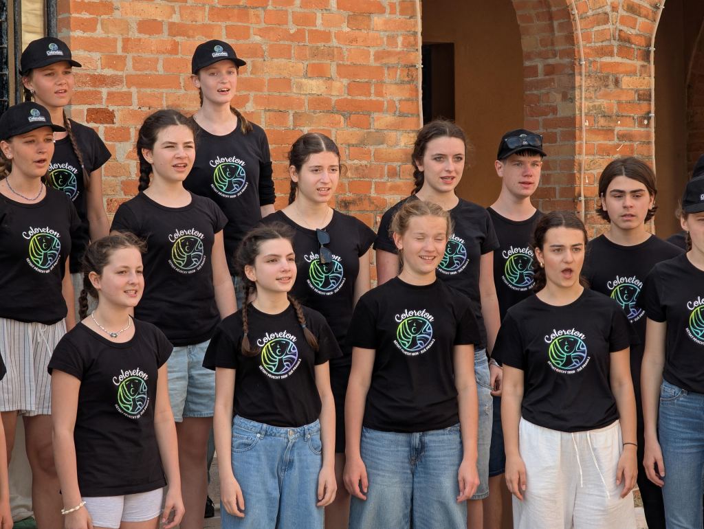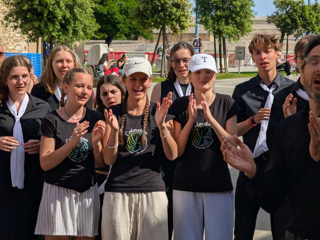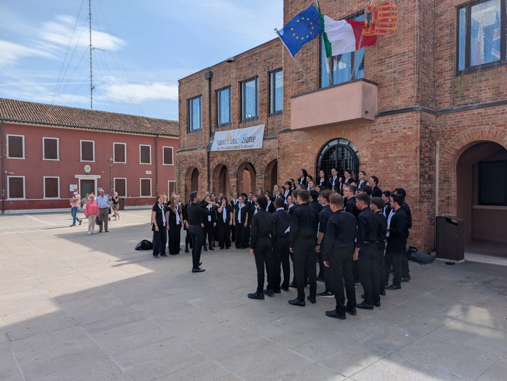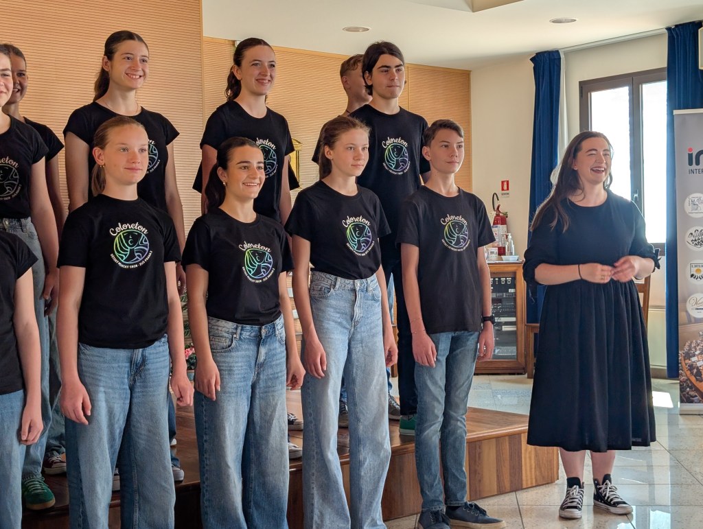Dnes byl důležitý den, už od rána plný velkého soustředění, těšení a švitoření. Čekala nás hned dopoledne folklorní kategorie. Akustika sálu nebyla příliš příznivá, museli jsme trošku pozměnit stání, aby se děti lépe slyšely a aby akusticky dobře vyzněly jednotlivé skladby. Akustická zkouška nebyla jen o nás, ale i o sladění violoncella a klavíru (elektrického). Sbomistryně v Česku míní, italské soutěžní prostory mění. Na poslední chvíli vznikla dneska spousta změn, se kterými se ale zpěváci profesionálně poprali. Podali absolutně soustředěný a přesvědčivý výkon. Od poroty se po doznění Sokolových očí ozvalo jen tiché …wow. Protože podle harmonogramu bylo jasné, že večeři nestihneme – a to hlavně kvůli siesty, kterou tady restaurace velmi striktně dodržují (siesta je tedy to jediné, co tady striktně dodržují). Otevřeno mají totiž do 14:00 a pak až od 18:00 do pozdního večera. Po soutěžním vystoupení jsme tedy letěli na teplý oběd. Obsluha nás už z dálky přátelsky vítala a usadila nás na naše obvyklá místa. Poté jsme se rychle převlékli na hotelu do sborových triček a běželi na pop-up koncert, který se měl spontánně (plánovaně spontánně..) konat na náměstí. Prvně jsme dostali špatné instrukce o konání, a tak po krátkém rozchodu jsme se na pop-up koncertě potkali se švýcarským sborem. My jsme jim zazpívali Teče voda teče a I’Paradisi. Oni z nás byli absolutně nadšení a moc se chtěli družit a kamarádit. Oni se chtěli naučit naši africkou, a tak z nespontánního nařízeného open-air konertu vznikl opravdu spontánní workshop. Švýcaři pak Coloreton učili spirituál, kde jen půl hodiny naše děti pobíraly tleskání a pleskání. I když bylo původně v plánu odejít odpočívat na hotelu, děti se další hodinu družily. Po skupinkách se společně učili jednotlivé hlasy jejich spirituálu a pak si to společně zazpívali ve velkém kruhu. To všechno ale proběhlo bez paní sbormistryně, paní klavíristky a Dominika, ti šli na DP (dirigentské povídání), kde každý porotce každému sboru individuálně dává zpětnou vazbu na vystoupení.