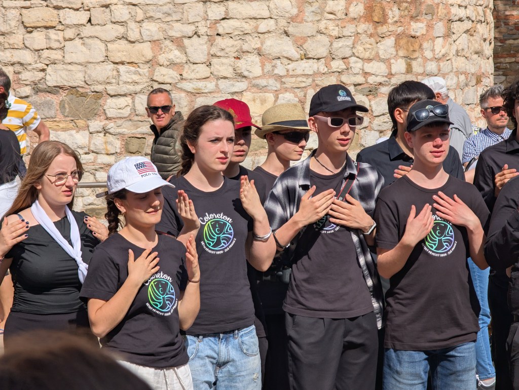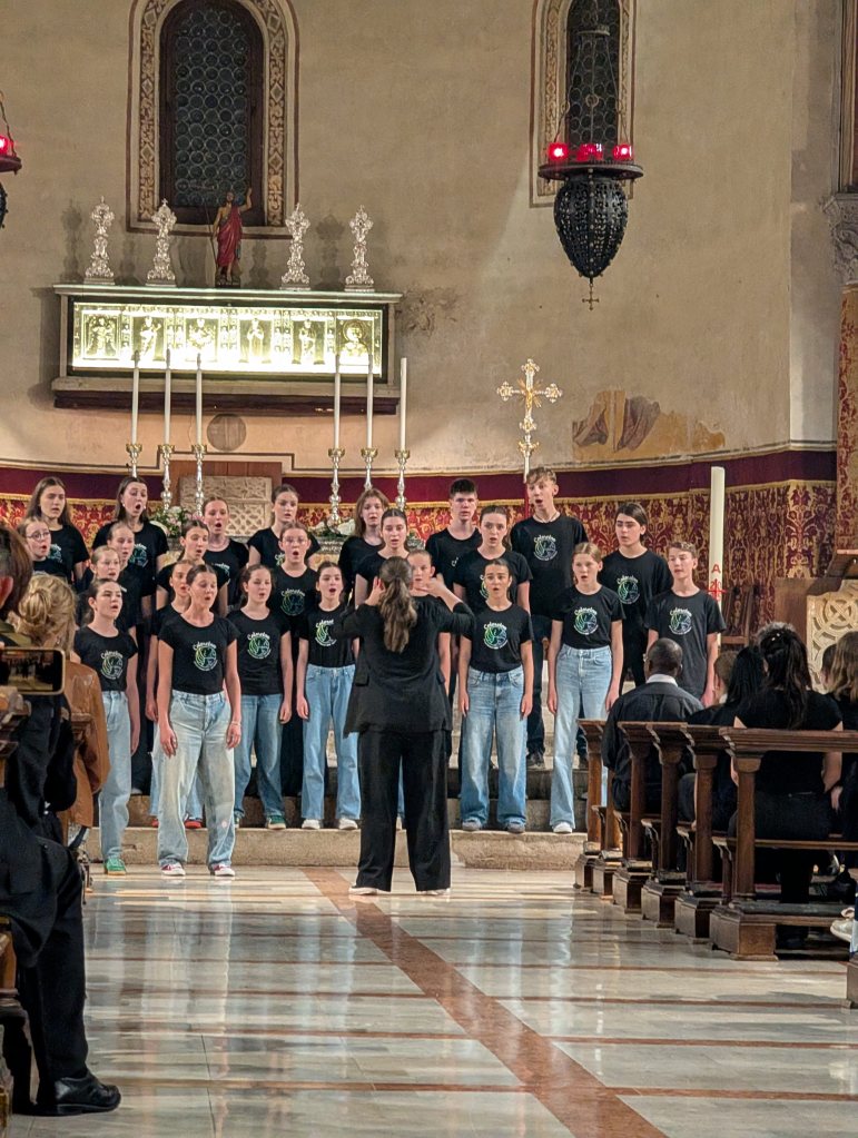 Měli jsme za úkol zvolit 2 skladby. Všechny ostatní sbory zpívaly stále dokola ty stejné skladby, neslyšeli jsme nic nového. My jsme si ale připravili program, který byl původně pro Grand Prix, porota ale Grand Prix zrušila, protože nenominovala dostatečný počet sborů, které by se mohly o hlavní cenu absolutního vítěze utkat. Avšak bylo nám řečeno, že si máme dát pozor, co zpíváme, protože to musí být něco, co se hodí do katolického kostela. A je to tady zase. Děti si velmi přály zpívat Vodu z Bodroga… tak jsme udělali válečnou telefonickou poradu se sbormistry z Plzně (máváme Kajetánu! :D ) co teď? V porotě sedí paní z Chorvatska a paní z Bulharska… jakmile zazpíváme „podzme še polubic do gušieho chlivka…“ je po nás. „Změňte slova! Přetextujte to na procházení do lesíka!“ zněly plzeňské rady. Takže jsme šli „pochodzic do gušieho chlivka“, aby to bylo korektní pro všechny přítomné slovanské jazyky. Evening rise mělo v kostele pěkný efekt, ale Vodou z Bodroga děti zbořily kostel. To všem málem odfúklo kilt! Sklidili jsme největší potlesk, standing ovation! A přišlo na vyhlašování.