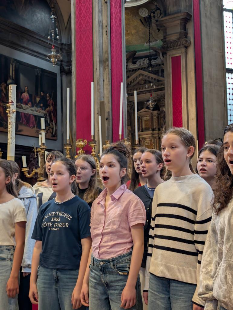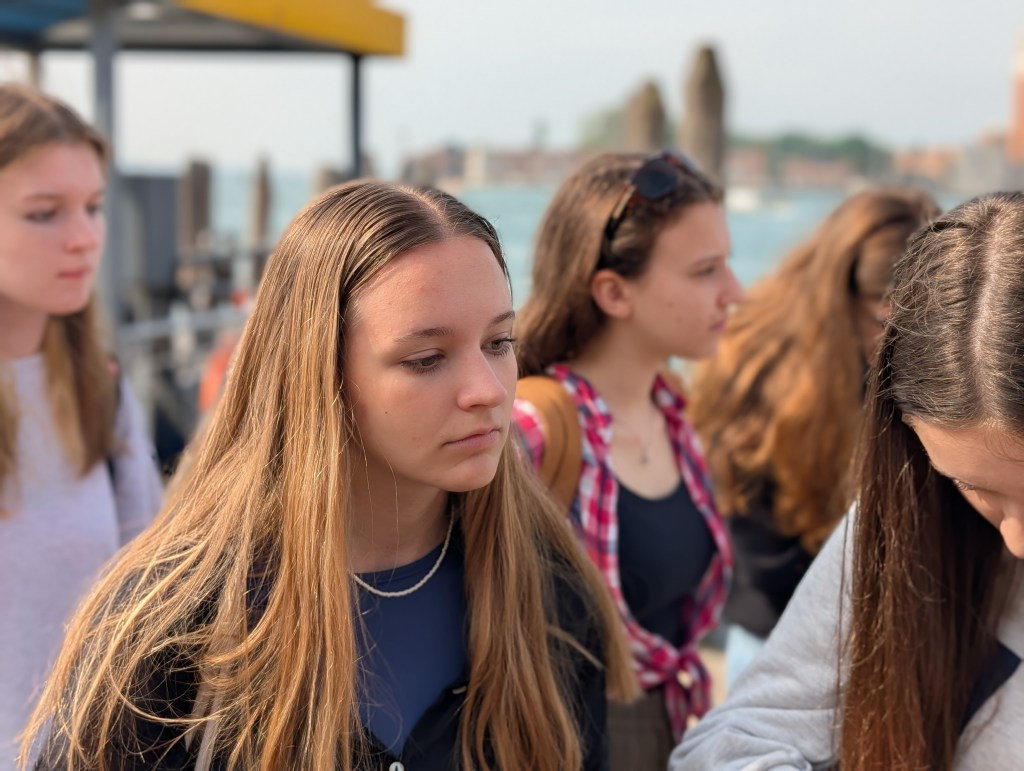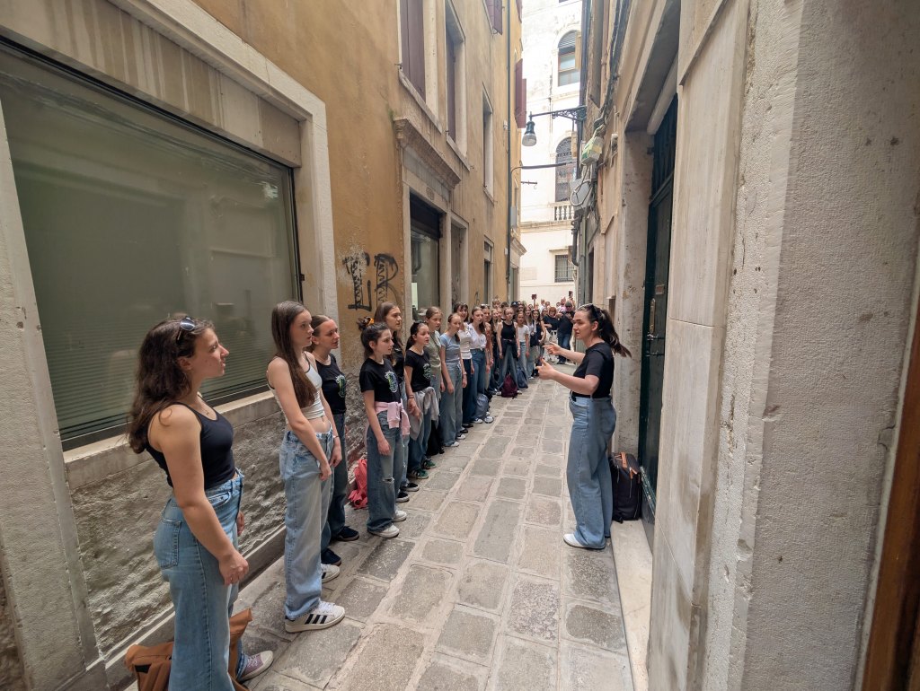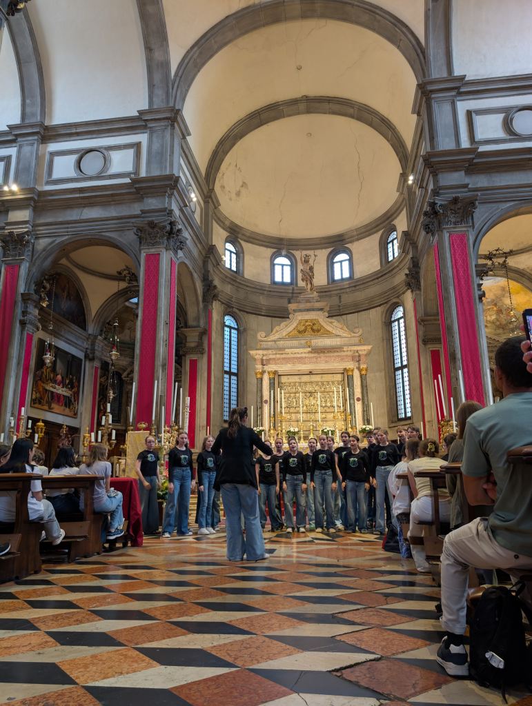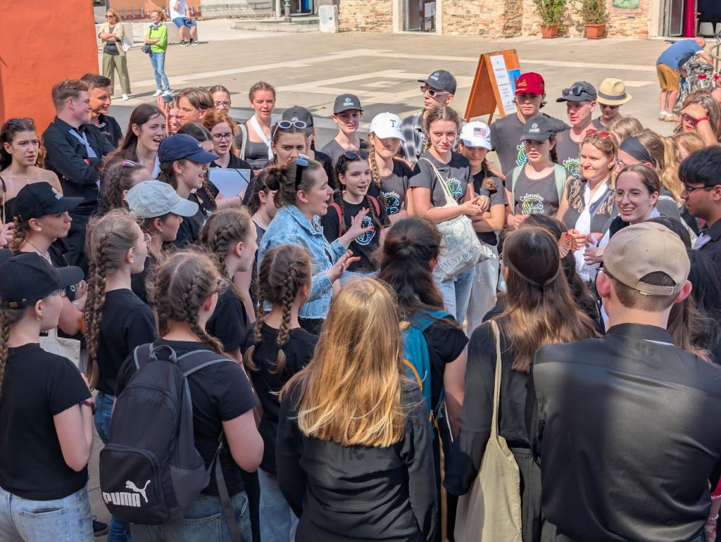 Přiznejme si, že ranní vstávání za svítání nebylo úplně příjemné. Chystali jsme se na dnešní celodenní pobyt mimo Caorle. Snídaně už 6:30, v 7:00 nás čekal autobus a zavezl nás do přístavu Punta Sabioni, kde se potkaly všechny sbory a společně jsme se odplavili do Benátek. Každý sbor dostal svého průvodce, se kterým odešel na akustickou zkoušku do Chiesa di San Salvador, kde nás odpoledne čekal benátský Friendship koncert. Každý sbor měl v kostele 10 minut na zkoušku, které se přísně dodržovaly. Protože jsme všechno stihli ve velkém časovém předstihu, děti se nasvačily a dostaly rozchod.