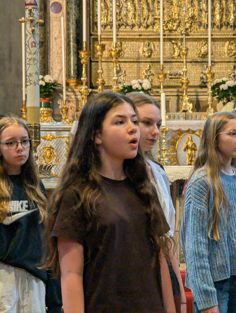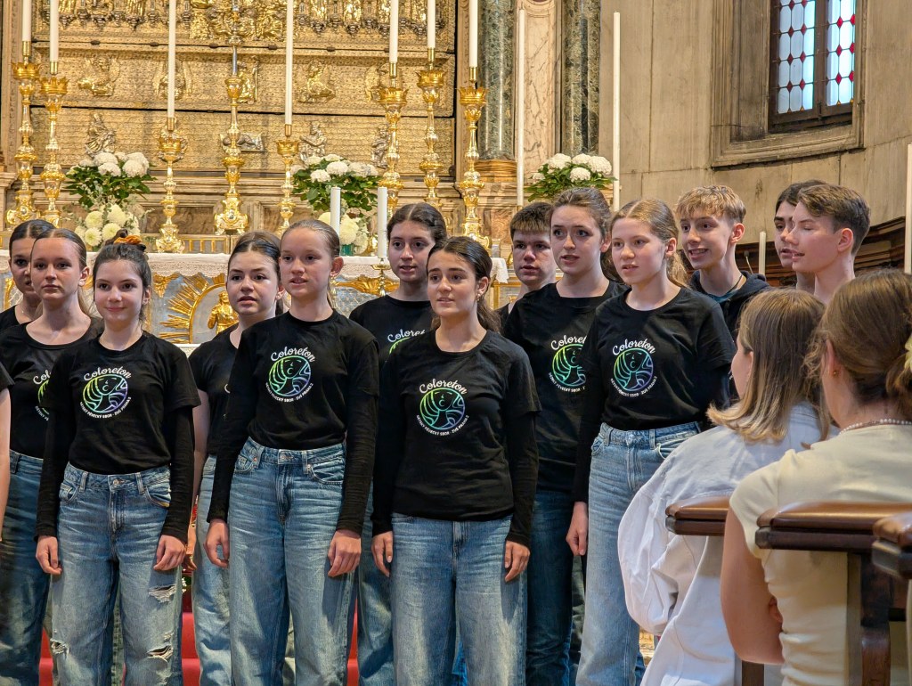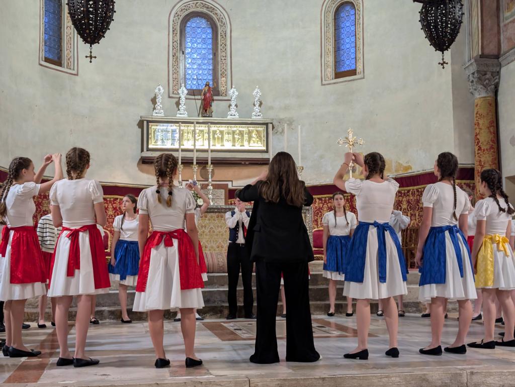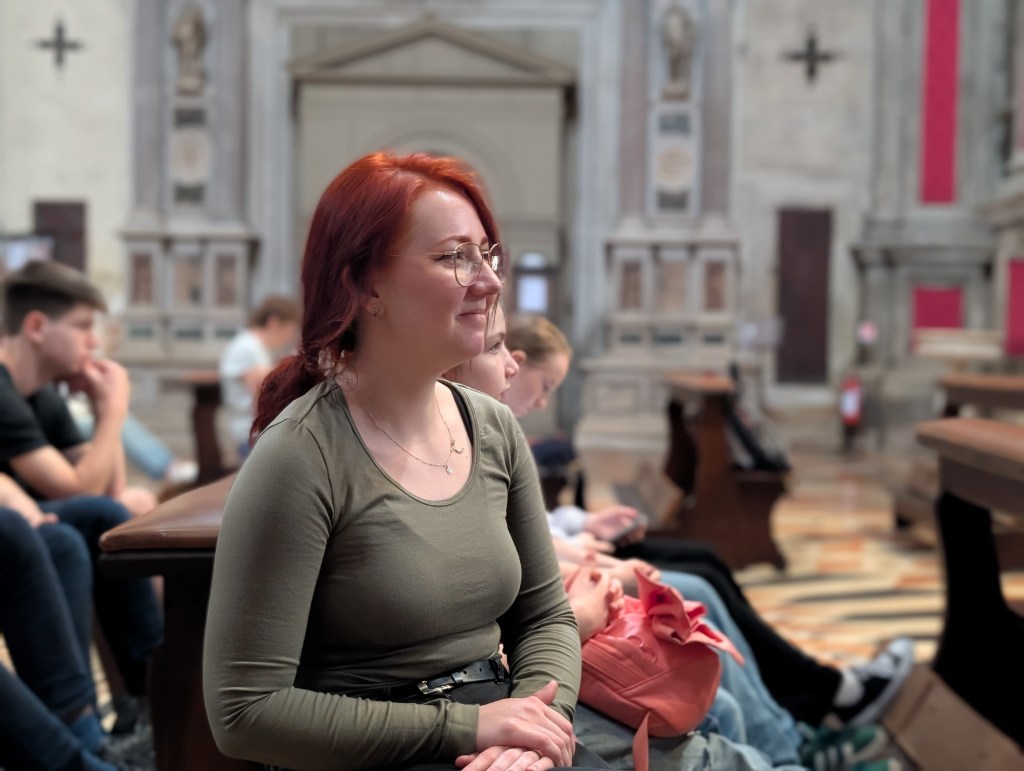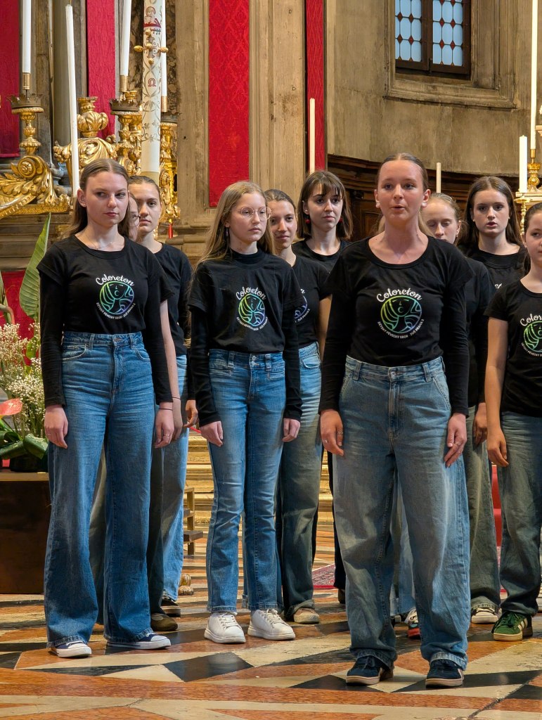 Sem si dovolíme vložit malou vsuvku. 3/5 dospěláků vyrostly ve sboru Permoník, který na každý zájezd bere tzv. „zeleného panáčka“. Jedná se o zelenou figurku, která přináší sboru krásné počasí na zájezdech. Díky naší Andulce Lahodové, která neváhala a chopila se velké role vytvořit něco, co bude nosit hezké počasí nám, a uháčkovala sborové sluníčko. A ono dneska zafungovalo! Měla být zima a pod mrakem, bylo teplo a krásně jasno. Rozchod se proto nabízel, a těsně před vypuštěním dětí do víru velkoměsta jsme stihli udělat fotku před Ponta di Rialto. Sraz jsme si dali u kostela hodinu před oficiálním srazem všech sborů. Naše manažerka Lucka vyčíhla boční uličku, kde frekvence lidí nebyla tak velká. Rychle nás tam všechny nahnala, abychom si mohli udělat hlasovku a zazpívat si. Lidé si nás natáčeli a na závěr také zatleskali. Poté jsme se uchýlili do chladu kostela, kde zničehonic začala mše. Posloucháme.. a najednou zjišťujeme, že je nám jazyk povědomý – ta mše je totiž v polštině! Mše po hodině skončila. My jsme nahodili sborová trička a šli na věc.