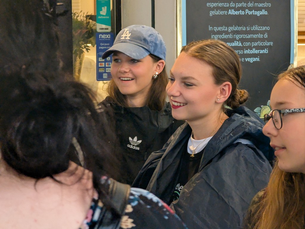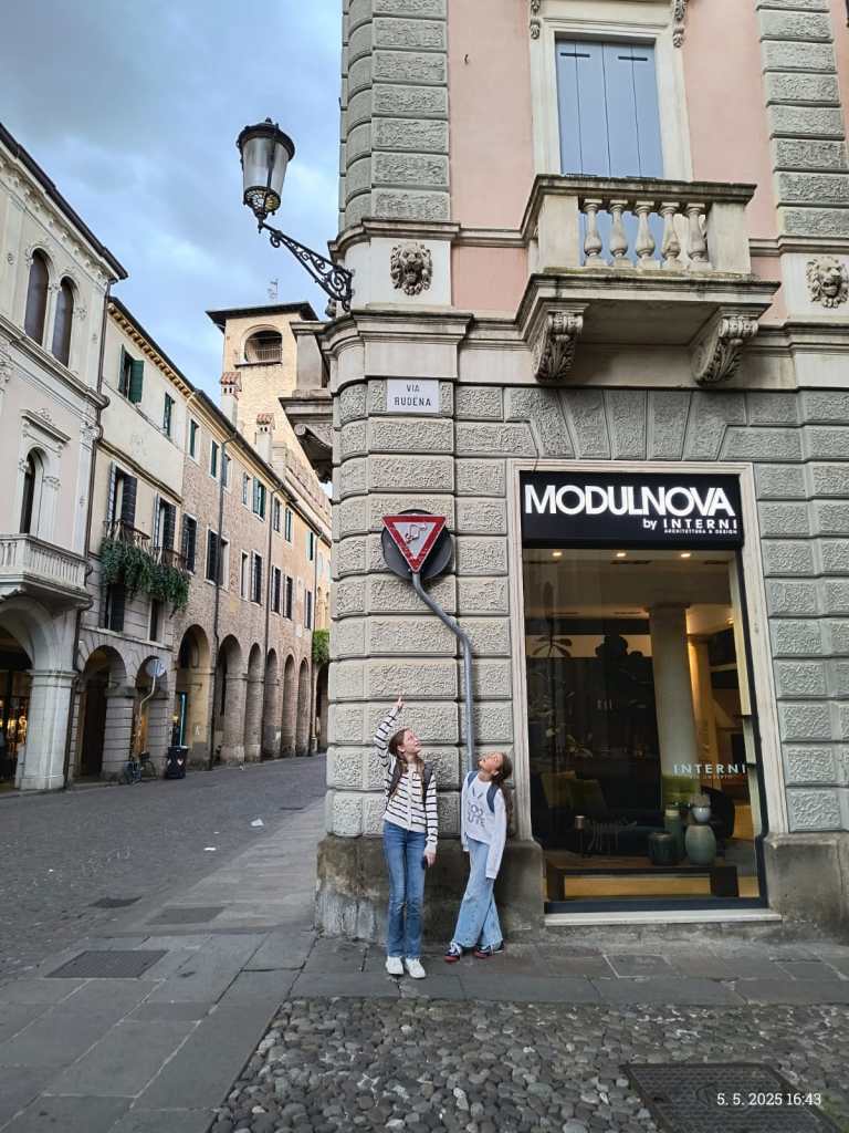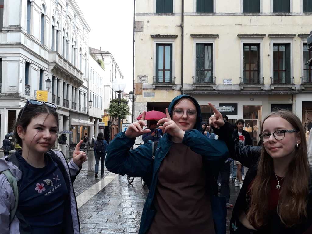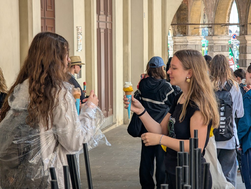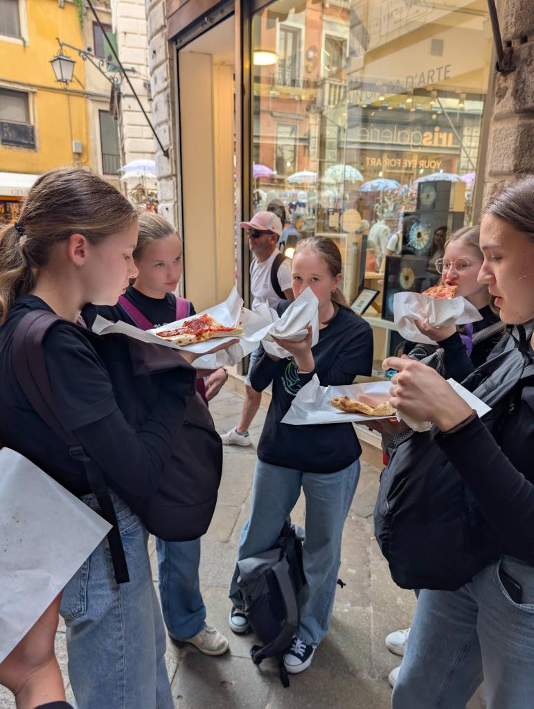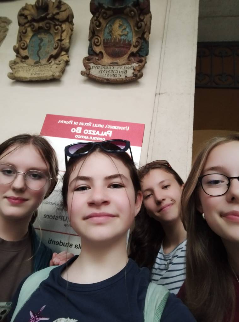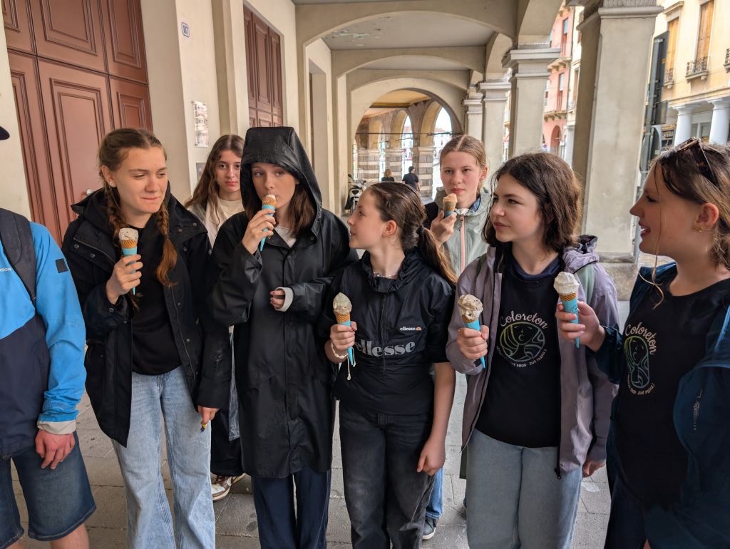 Ráno jsme si přispali a posunuli snídani na 9:00, aby si děti opravdu odpočinuly. V 10:00 už jsme byli na cestě do Padovy. Paní sbormistryně slíbila dětem za životní výkon na soutěži zmrzlinu, do teď si ji děti kvůli soutěži dát nemohly, a proto Silvi vygooglila nejlépe hodnocenou gelaterii v okolí a byla to úplně první zastávka v Padově. Příchutě jako citron s bazalkou, ostružina, čokoládová hruška, bílá čokoláda, pistácie, banán v čokoládě, stracciatella… výběr byl pestrý, všichni si vybrali. Poté si děti odhlasovaly, že by radši chodily ve skupinkách než abychom chodili po městě společně. Dostaly tipy, co můžou v Padově navštívit, (Bazilika sv. Antonína, Padovskou univerzitu, Piazza dei Signori s nejstarším orlojem svého druhu na světě,…), dostaly nabalený oběd ve formě sendviče, sladkou tyčinku dle vlastního výběru, kostičku parmazánu a sušenky TUC, a vypustili jsme je do města na celý den. I když jsme se dešťovým srážkám úplně nevyhnuli, bylo příjemné teplo, s deštěm svítilo sluníčko. V průběhu dne ale ještě všichni plnili challenge – vyfoť se s co nejvíce lvi, které najdeš. Ono totiž Benátky (a jak jsme zjistili, tak i Padova) jsou spojeny se svatým Markem, jehož symbol je právě lev. Lvy lze najít jako sochy, reliéfy, klepadla u dveří, zvonky, dekorace,… Podívejte se do fotolgalerie níže, jak celodenní výzvu všichni zvládli! (bude asi třeba fotky rozkliknout, náhled se nezobrazuje celý, pozn. red.) Na konci putování, už když jsme se potkali zpět na srazu, jsme si před Bazilikou di Santa Giustina vysvětlili, proč právě lev. Na bazilice jsou totiž vyobrazené všechny 4 atributy všech čtyř evangelistů. Lev – Marek, býk – Lukáš, lidská tvář/anděl – Matouš, orel – Jan.