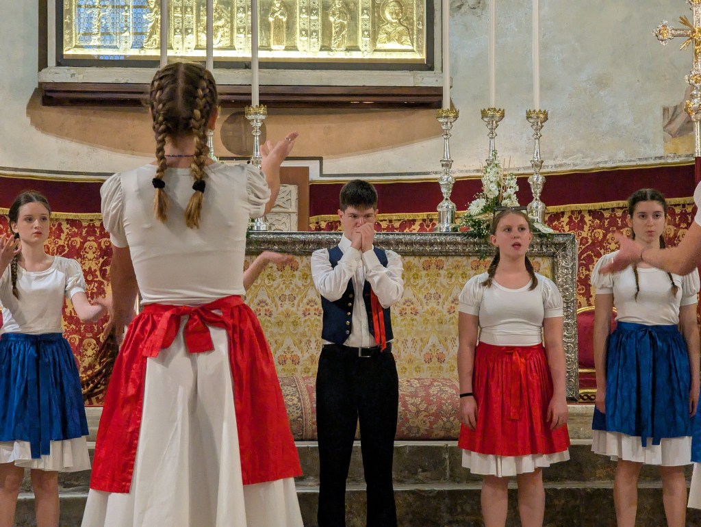 Po příchodu na hotel jsme si rozdali večeři – dnes tousty s ricottou, salátem, okurkou a šunkou (vlastnoručně pedagogickou manufakturou vyráběné) a k tomu kus perníku ještě z naší domoviny – poslední kusy! Po odpočinku jsme se převlékli do folklorního kostýmu a v něm vyrazili na Award Ceremony a závěrečný koncert, kde vystoupily 4 sbory. My jsme v tom kostele opravdu už jako pečení vaření. Po úvodním proslovu osobností festivalu začaly výstupy jednotlivých sborů. Nás nechali na konec – jako kdyby věděli…