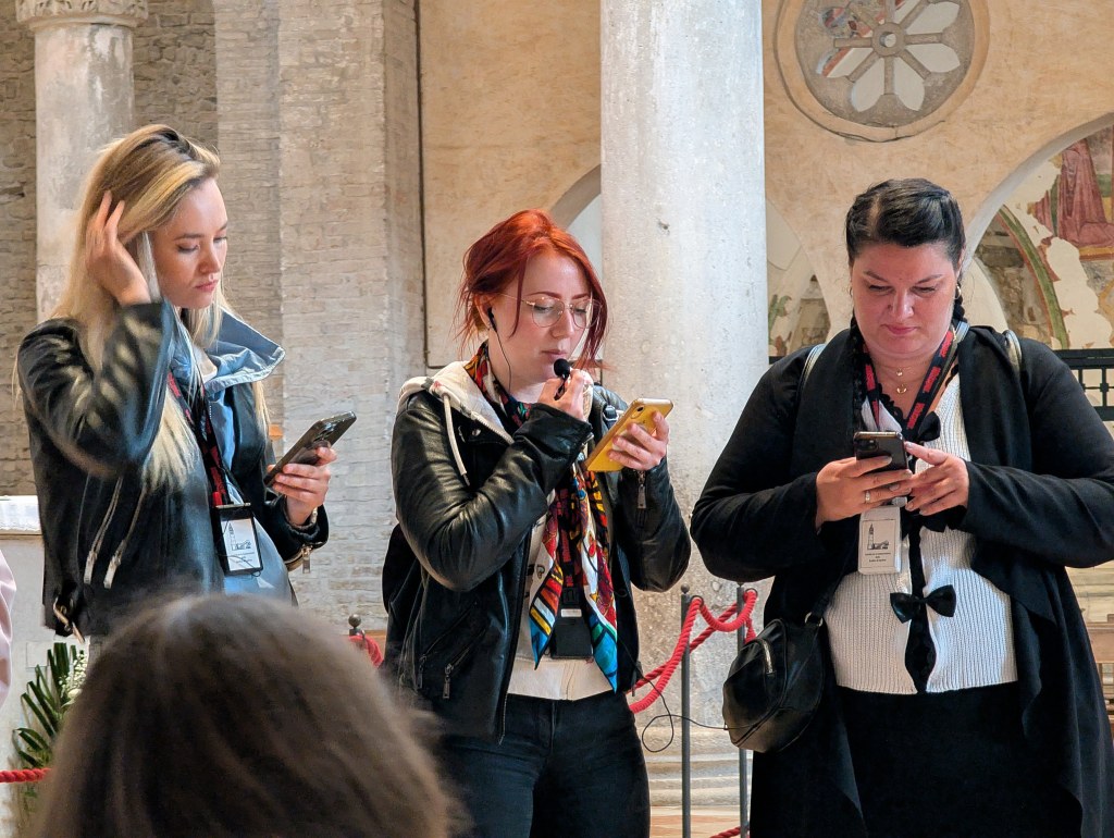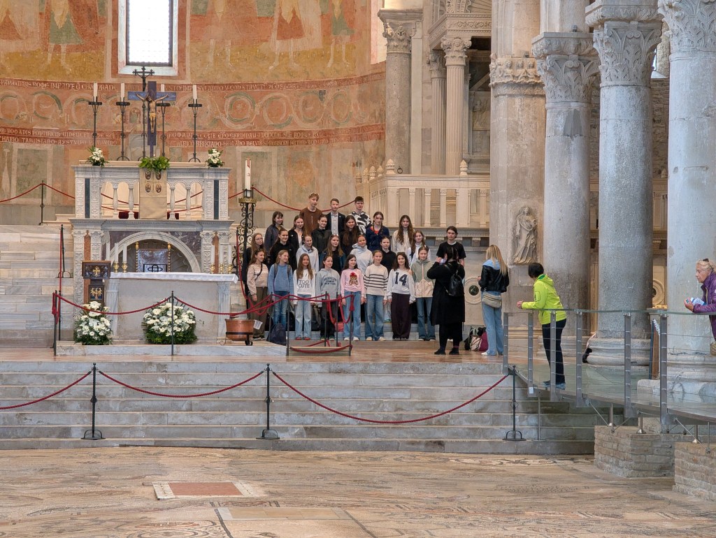 Prvně jsme hromadně zamířili do Baziliky di Aquileia, kde jsme měli domluvenou rezervaci prohlídky. Povinně jsme z jejich pověření museli za poplatek nafasovat naslouchadla a naše manažerka Lucka dostala mikrofon pro průvodce. S pomocí tetičky Wikipedie a stryčka Googla jsme tedy slyšeli výklad o této staré budově z 11.století a o krásné nejstarší křesťanské mozaice. Ta se rozkládala po celém půdorysu baziliky, byla totiž nalezena v minulém století pod zemí. Její původ sahá až do 4.století našeho letopočtu. Děti dále v bazilice mohly rozeznávat jednotlivé umělecké slohy. Paní sbormistryně dávala dětem indicie, podle kterých můžou slohy poznat -> je to přezdobené, přeplácané, jsou tam andělíčci a spousta zlaté barvy = baroko! Lomený oblouk = gotika! Sloupy = inspirace antikou nebo samotná antika. Vstoupili jsme i do krypty, kde se dále mozaika rozkládala a mohli jsme ji dál zkoumat a pozorovat. Všude byly průhledné “můstky” se zábradlím. O pořádné sborové drama se postarala Kristinka Rowland, která když se nahnula, spadly jí sluneční brýle do prohlubně, kde se nacházela jedna z nejstarších mozaiek z celé baziliky a vstup tam byl zakázán. Naši kluci se prvně snažili Kristince pomoct a lovili brýle deštníkem. Bez úspěchu. Situaci se ale podařilo vyřešit, pánové z ochranky byli velmi ochotní a brýle vylovili. Poté, co jsme svým českým šarmem (a troškou slziček) zapůsobili na místní ochranku, dovolili nám si v bazilice i zazpívat. Ale i to mělo striktní podmínky (ale to už nás ani nepřekvapuje, pozn.red.) – přijdete, postavíte se na ty schody (tam je nejlepší akustika) zazpíváte, odejdete a pak dodal- But only sacred music! .. no to jsme v šoku… už ale na vše připraveni. Bless the Lord, fotka a jdeme na rozchod. Naše bambini dostaly celoodpolední volno na procházky a kafíčka.