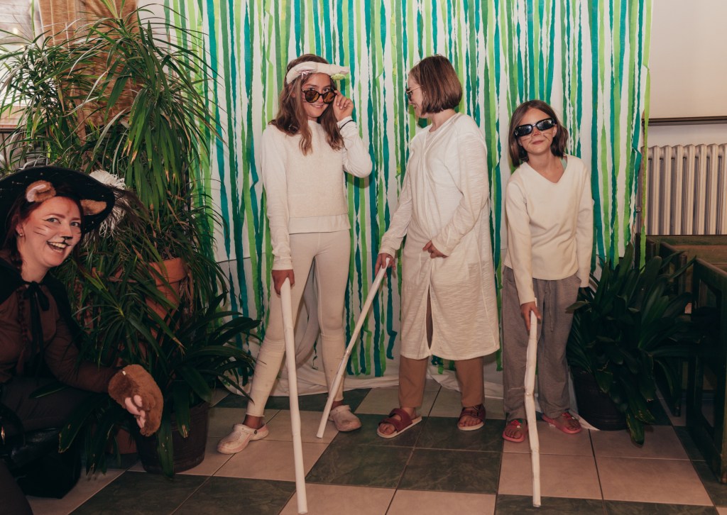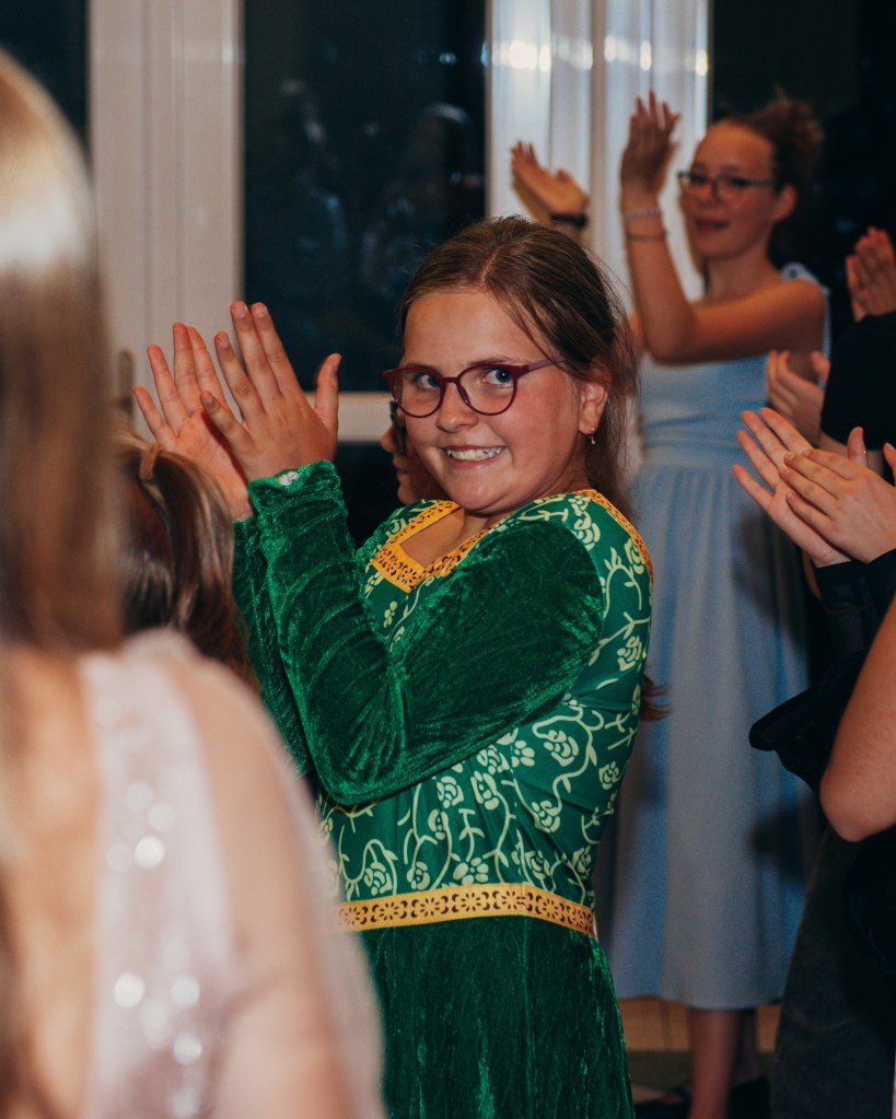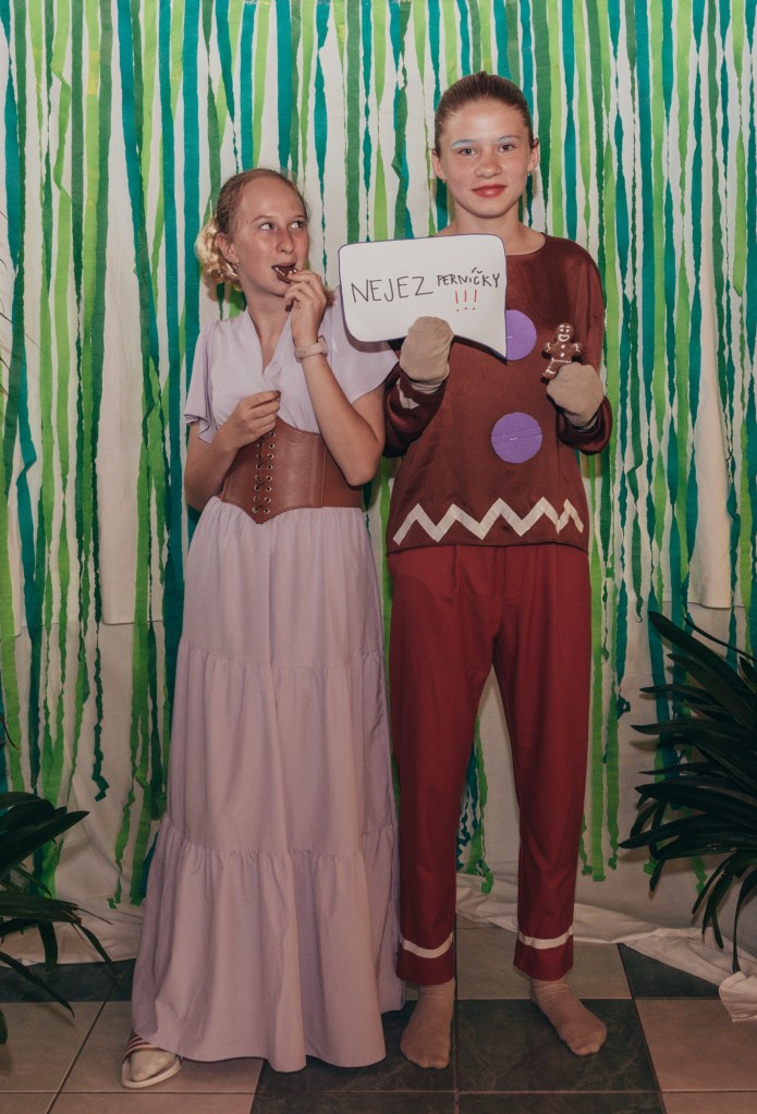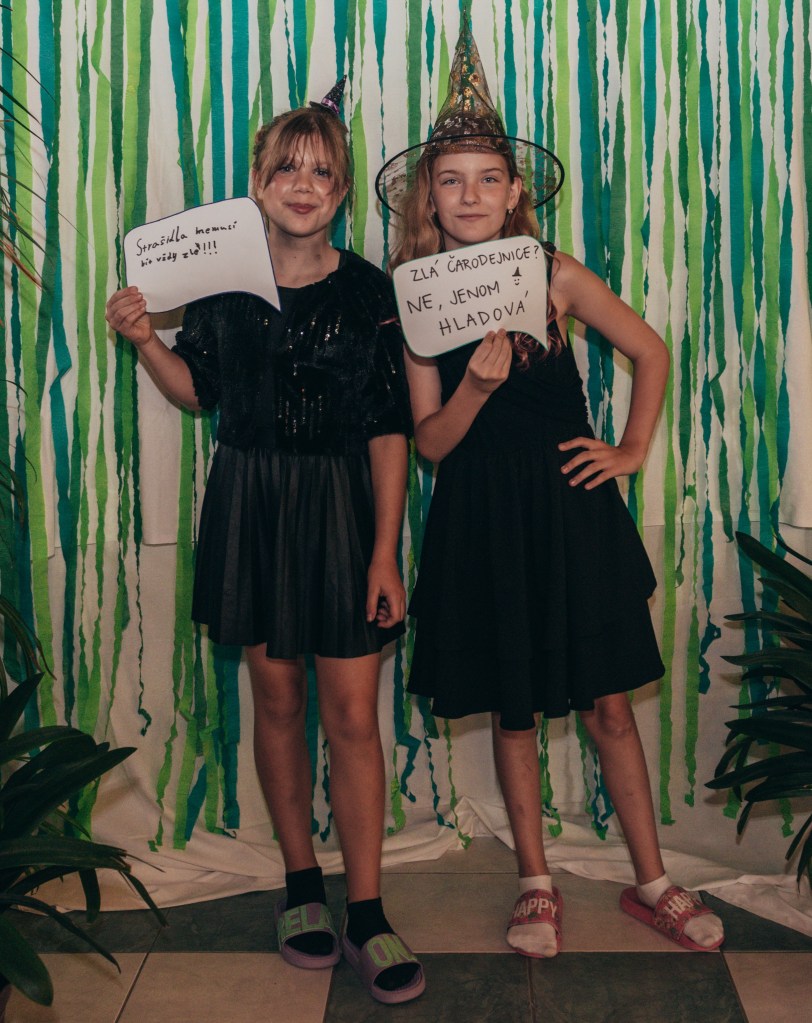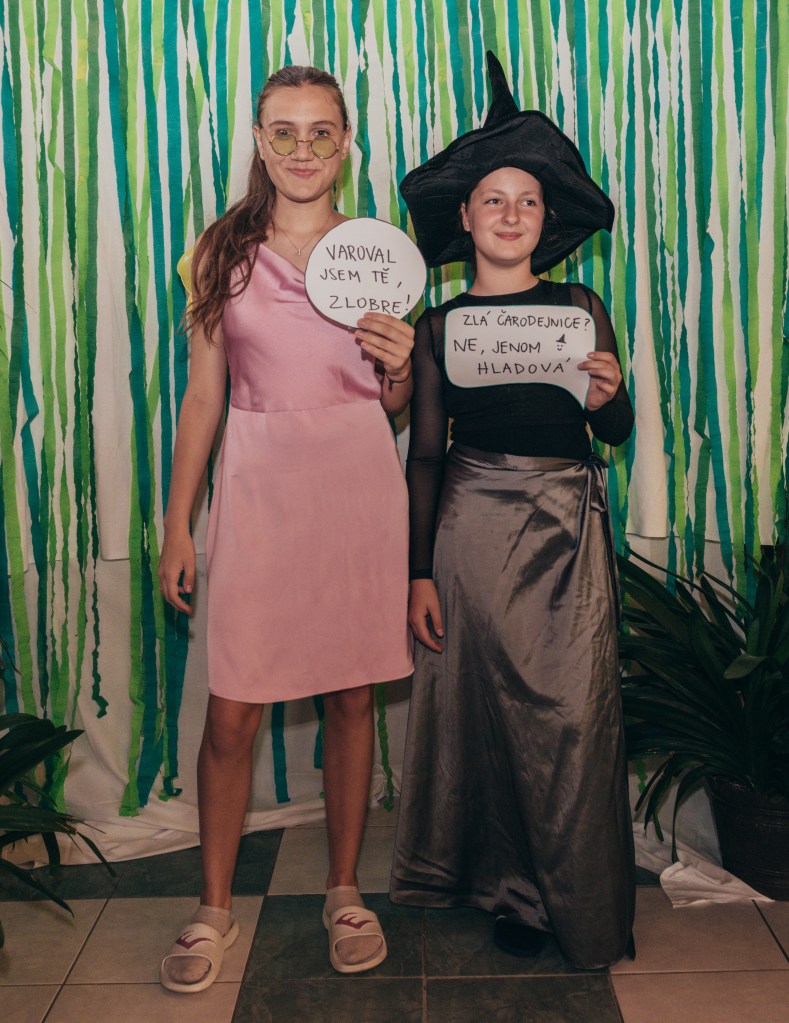 V rohu auly jsme postavili DIY fotokoutek s cedulkami a prostředím (co ŠvP dala – např. jsme stěhovali interierovou zeleň z celého přízemí na druhou stranu budovy, abychom měli „les“ – pro naše děti všechno!). Na místo dorazil také pan fotograf, který nám celou akci nafotil a fotil děti také ve fotokoutku. Kromě dvojic, trojic – pohádkových i těch opravdových kamarádských – vyfotil každému na památku taky samostatnou fotku v kostýmu. Pro všechny zúčastněné byl připraven také bažinový raut – želé oči, myši i žížaly, také kosti namočené v čokoládě a samozřejmě VIP Welcome drink. Děti pak hlasovaly o nejlepší kostým. Každý z nich rozhodně stál za to! Objevila se tam Fiona před proměnou (Johanka), Fiona po proměně i mini Fiona, kterou ztvárnila Majda Lahodová. Během volby nejlepší masky se hrála židličkovaná na populární melodie, které se ve filmu objevily. 1. kolo „všichni proti všem“ vyhrála Berenika Charšků. Hlasování dětí dopadlo takto: