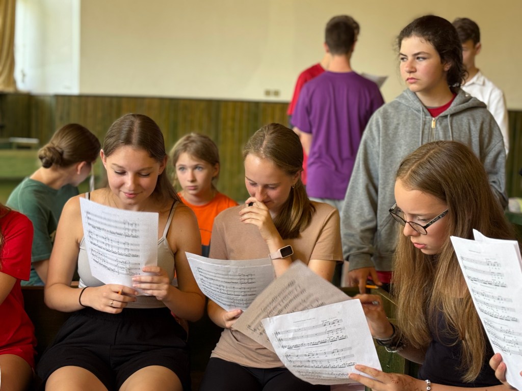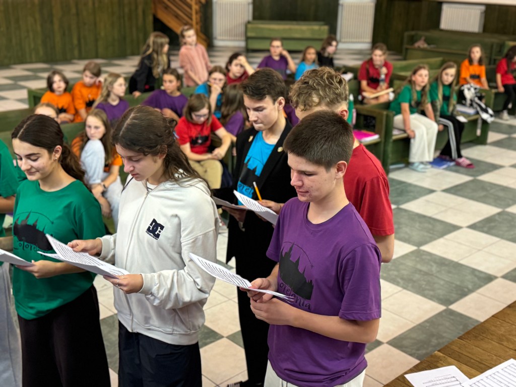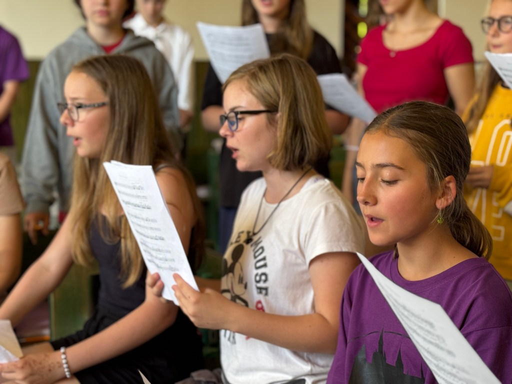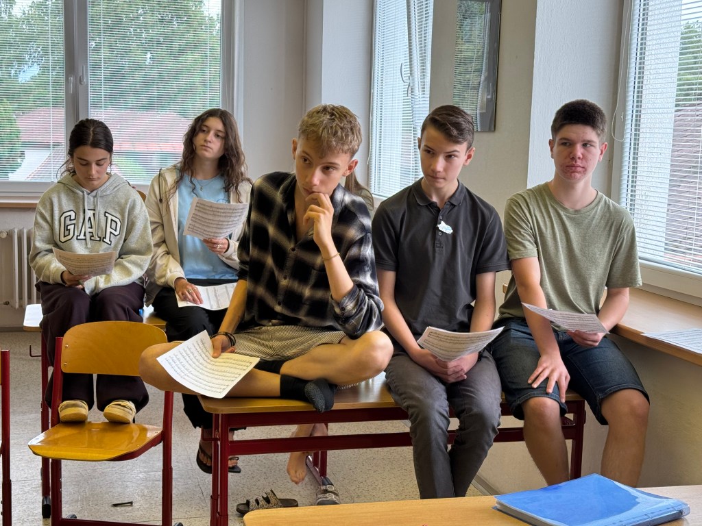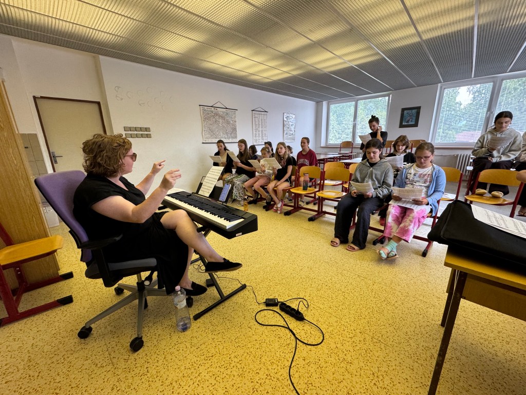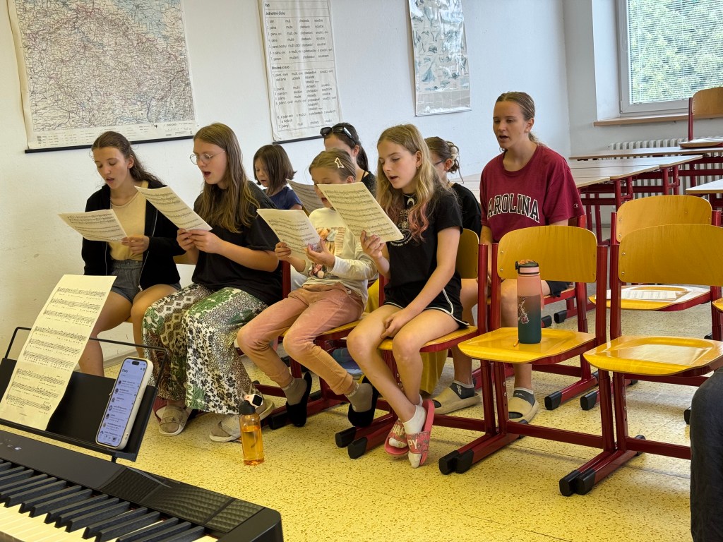 Od neděle do úterního rána vyjel do Hoštic pouze Koncertní sbor. Samozřejmě i s nováčky (našimi 1. ročníky), kteří tento týden zkouší zpívat s našimi nejstaršími. Kromě lidové písně Tancuj tancuj vykrúcaj zvládáme zpívat např. i hebrejsky, anglicky a latinsky… Nově příchozí do sboru dostaly své sborové maminky, které se o ně během zkoušek starají a pomáhají jim se zvládnutím repertoáru v průběhu zkoušek i mimo ně (nacvičují i v pauzách a v odpoledním klidu).