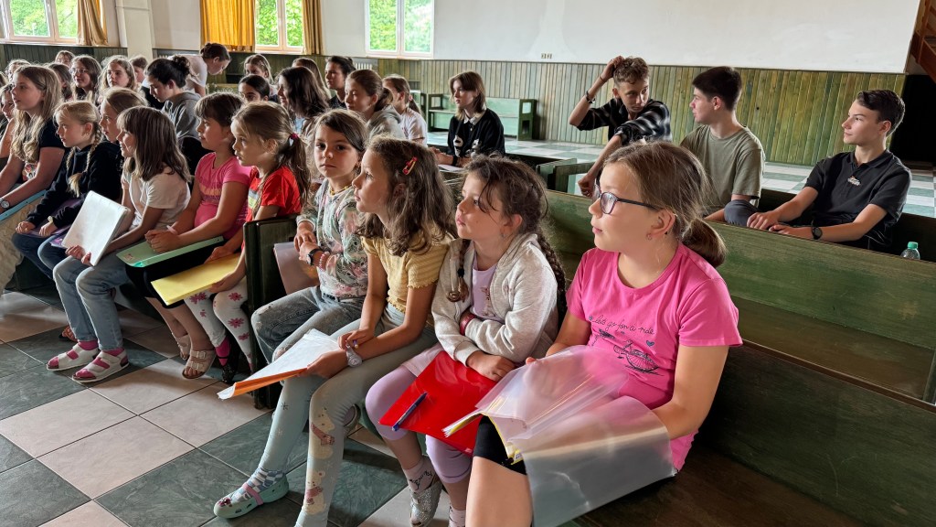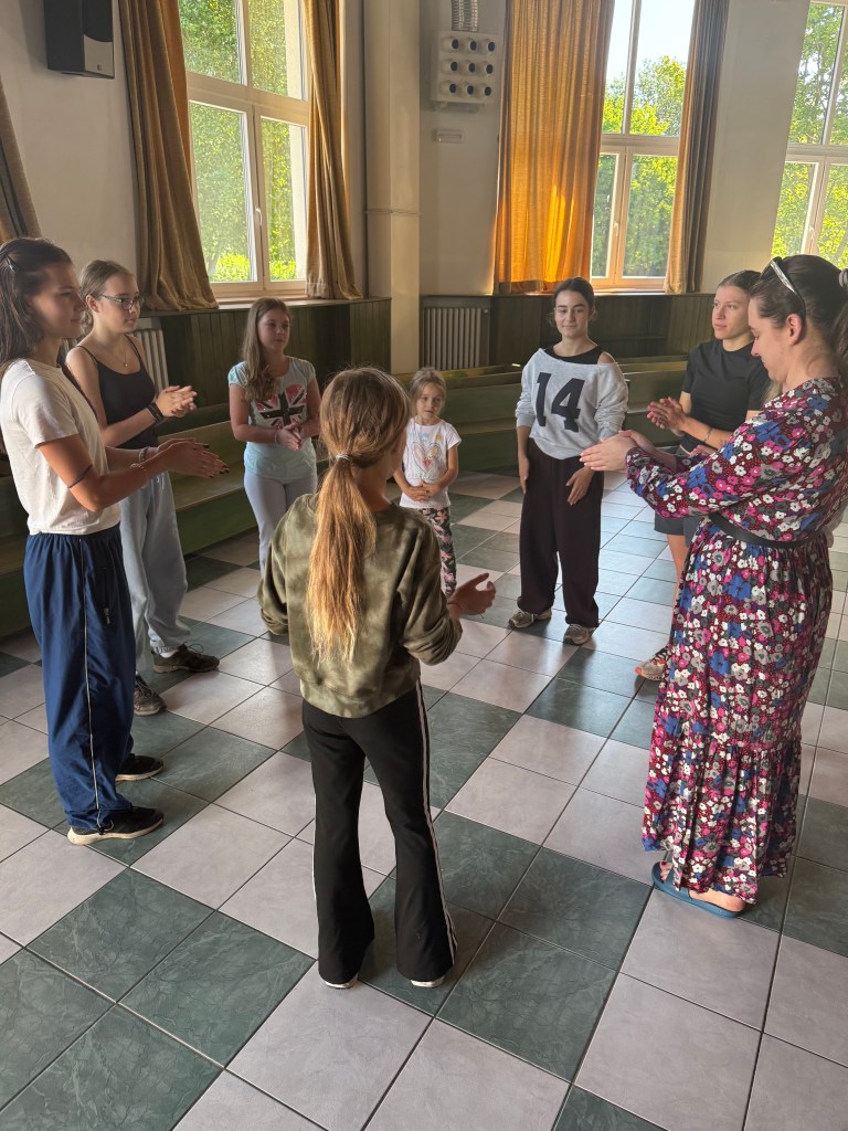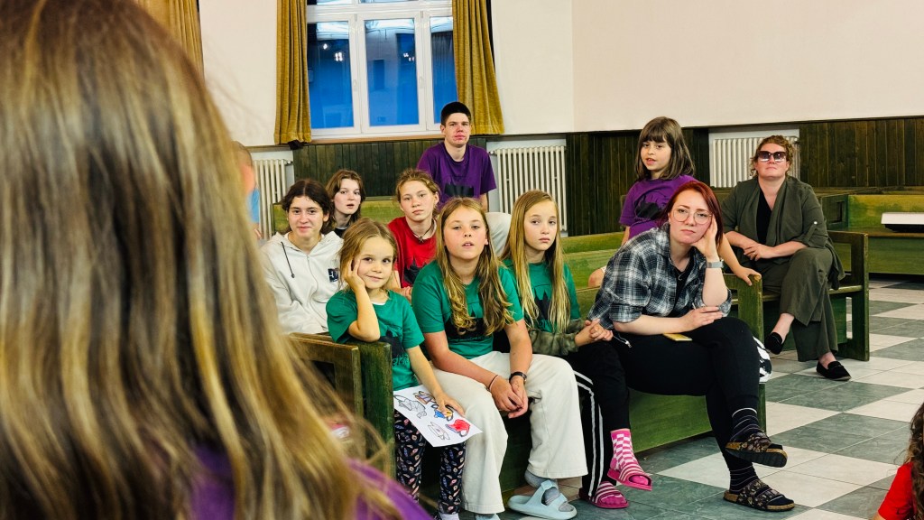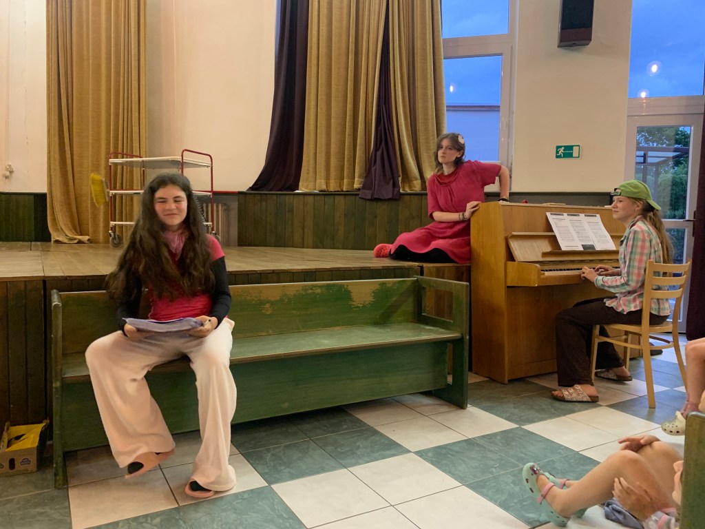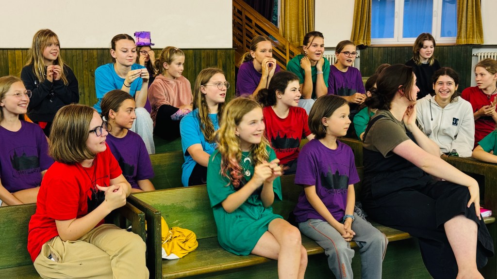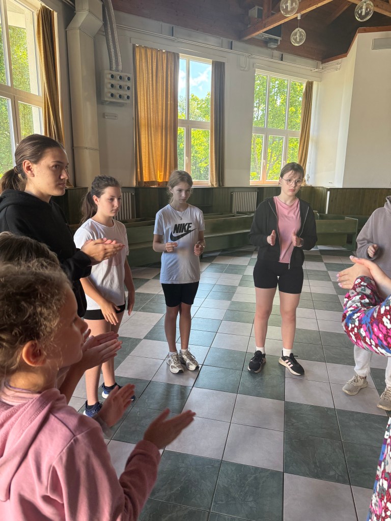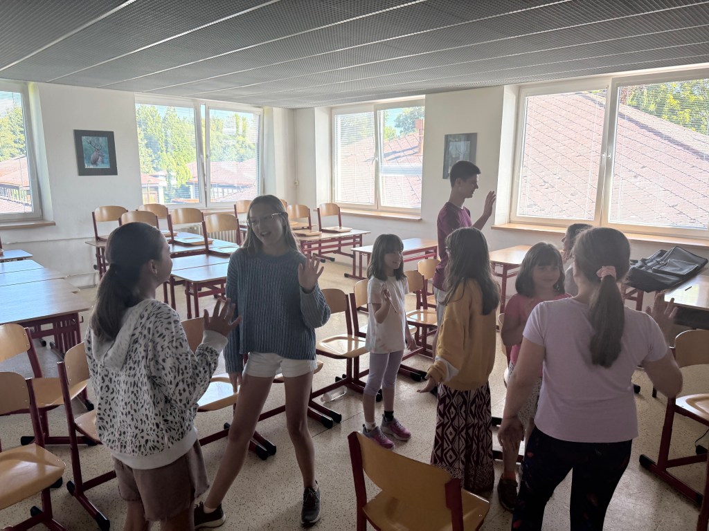 Od neděle do úterního rána vyjel do Hoštic pouze Koncertní sbor. Samozřejmě i s nováčky (našimi 1. ročníky), kteří tento týden zkouší zpívat s našimi nejstaršími. Kromě lidové písně Tancuj tancuj vykrúcaj zvládáme zpívat např. i hebrejsky, anglicky a latinsky… Nově příchozí do sboru dostaly své sborové maminky, které se o ně během zkoušek starají a pomáhají jim se zvládnutím repertoáru v průběhu zkoušek i mimo ně (nacvičují i v pauzách a v odpoledním klidu).