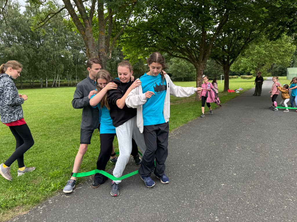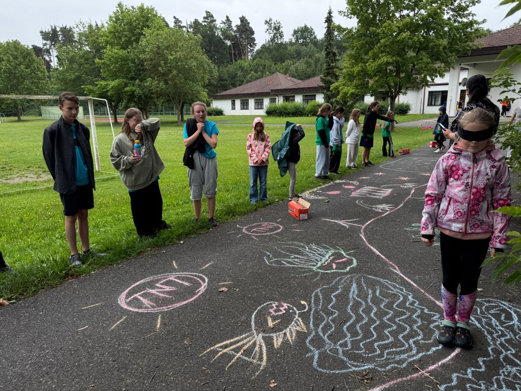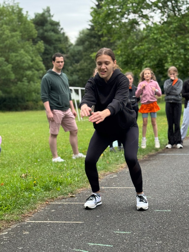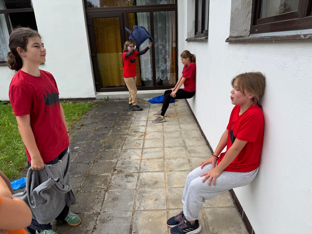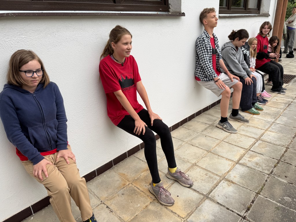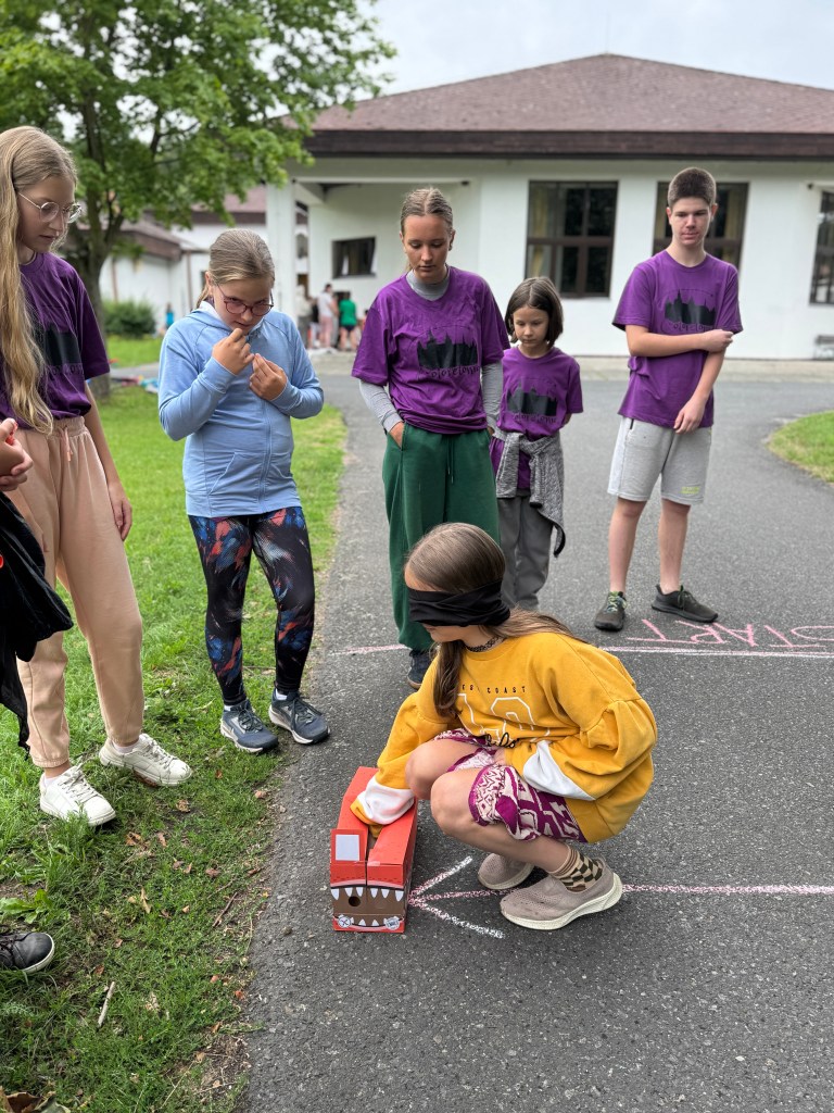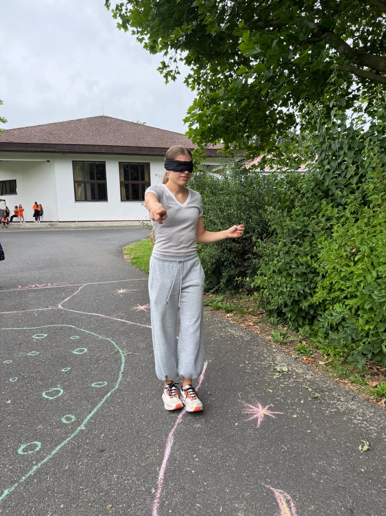 Dnešní dopoledne jsme podstoupili výcvik králičice Hopkavé na policejní akademii – děti byly rekruty, kteří musí na jednotlivých pohybových disciplínách předvést co nejlepší výkon. Poznali jste pohádku? Ano, nacházíme se v Zootropolis! Trojskok do dálky (Eva Soukupová je skokanem dne – a nejen ním, viz níže), na další disciplínu se přesouváme “do vězeňského bloku”, členové oddílu vytvořili za sebou řadu a speciálními pásky se suchým zipem kolem kotníků byli “spoutáni” do jedné jednotky, jejímž úkolem bylo spolupracovat a koordinovaně se přesunout z bodu A do bodu B (ve hře východ z vězení). Milí čtenáři, vzpomínáte si na včerejší hru spící princezny, která měla být na 10 minut a naši zpěváci tvrdohlavě předstírali spánek třičtvrtě hodiny? Totéž se opakovalo i u úkolu, který ověřoval vytrvalost a pevnou vůli – sed u zdi (sezení zády ke zdi s koleny do pravého úhlu, po chvíli nohy v ohni). Naši rekruti si nenechali říct, předháněli se navzájem, kdo déle vydrží, přišel čas oběda, začalo mrholit, uplynulo 20 minut od začátku… a oni stále seděli. Nejvytrvalejší byly Cilka Heřmanová, Linda Kunášková a Kačka Šulcová – vydržely tuto torturu celých 45 minut! Těsně před nimi (40 minut) vydržela Diana Vysočanová, před ní to 35 minut držela Ela Dolejšová. Klaníme se, předáváme bonbonek a na večer magnesium proti svalovým křečím.