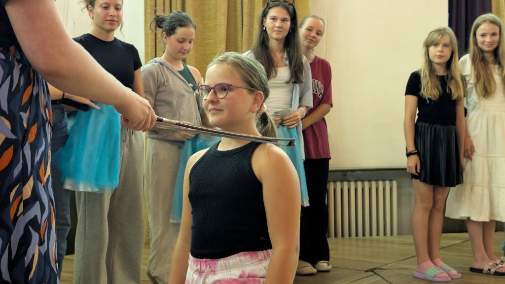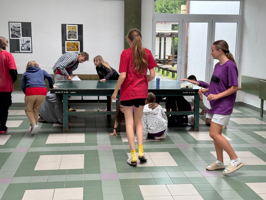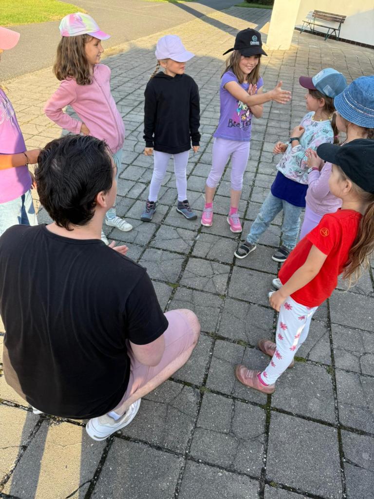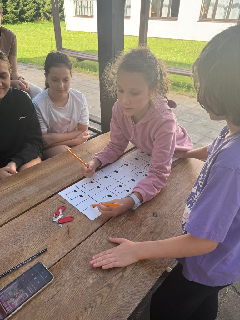 Dnešek začal budíčkem a nápaditou rozcvičkou i s choreografií holek z týmu zelených (Kačka Sochová a Anežka Bartáčková) na téma Tanec princezen. Od princeznovského tance jsme vyrazili na snídani k vajíčkové pomazánce. Ráno se výjimečně nezpívalo, ale na děti čekala stanoviště, ktera měla prověřit jejich rytmické schopnosti. Hra na tělo (body percussion) při klavírní skladbě Rondo Alla Turca W. A. Mozarta, ťukání rytmu podle notových hodnot, rozdělení rytmu do rukou, skákání do rytmu, učení se nové hitovky Hi, Hello!