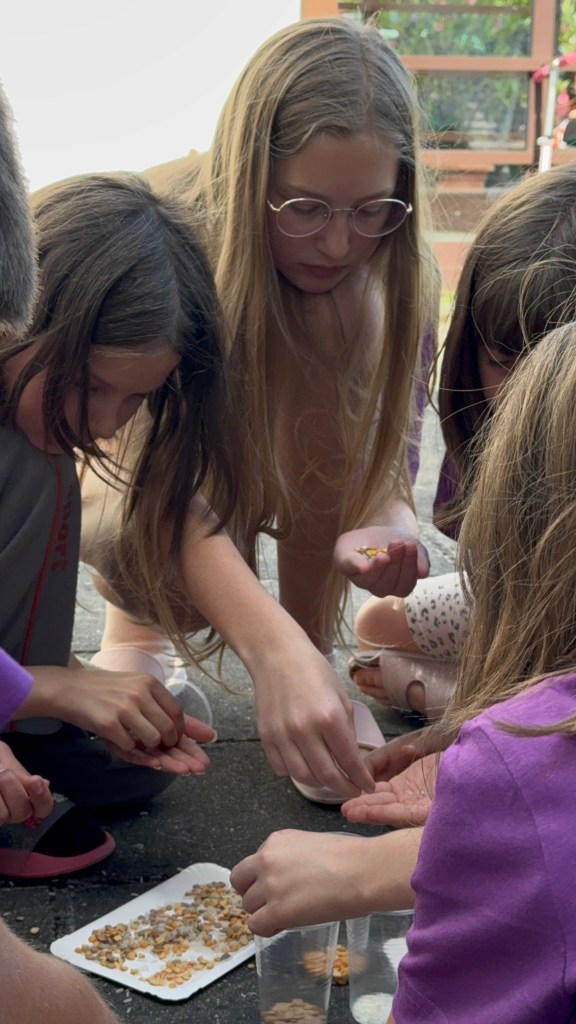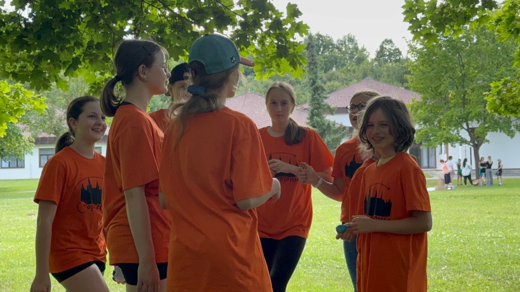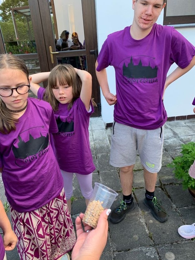 Po svačině přišlo velké překvapení pro týmy. Aby se nemusely stále převlékat do své barvy, každý z týmu dostal tričko s logem zámku Coloretonia ve své barvě. A teď už při každé hře dobře vidíme, kde se nachází který tým, krásně září z dálky a navíc jim náramně sluší. Ocitli jsme se v pohádce O Popelce, které jsme museli pomoct s tříděním čočky, hrachu a rýže. Nejlépe tuto výzvu zvládl tým oranžových pod vedením Evy Soukupové, ti vytřídili luštěniny nejdříve ze všech a správně. K obědu nás čekala čočková polévka. Náhoda? Nemyslíme si! Po obědě děti z Koncertního sboru povinně odpočívaly. Mají za sebou náročné dny a hodně práce. Poté pokračovala táborová hra pohádkou V Hlavě – každá emoce se prala s vyblednutím a u každé musely děti danou emoci prožít. Smutku se rozbil obraz zámku království Coloretonie, tak mu děti pomohly s nápravou. Stud se hodně styděl, a tak děti musely vymýšlet, kdy se nejvíc stydí a předvést to. U Nudy se museli všichni povinně nudit. Děti pomáhaly take ve skladu myšlenek správně roztřídit barevné myšlenky do řady. U vzteku pak bílé plátno, kde cákali barvami s emocí vzteku. Některá vzteklá vyjádření byla velmi autentická. Po svačince se už konečně zpívalo. Přípravka se učí písničku o kokršpanělech, Koncertní sbor o knedlících. Po večeři ještě zpíváme a mezitím, co Koncertní sbor má krásné časy na své dvouhodinové zkoušce, Přípravný sbor se ocitl v pohádce o Šípkové Růžence. Každý vyrobil Růžence růžičku, pro kterou si sama přišla.