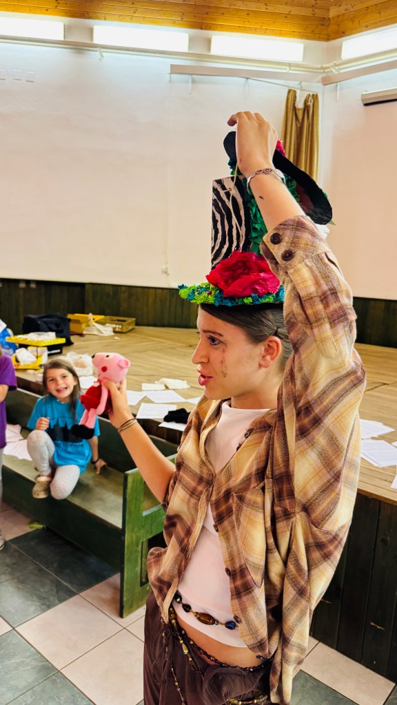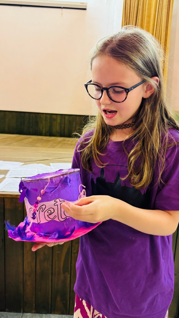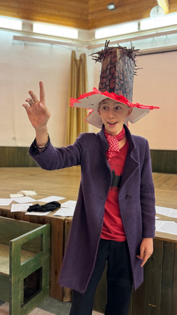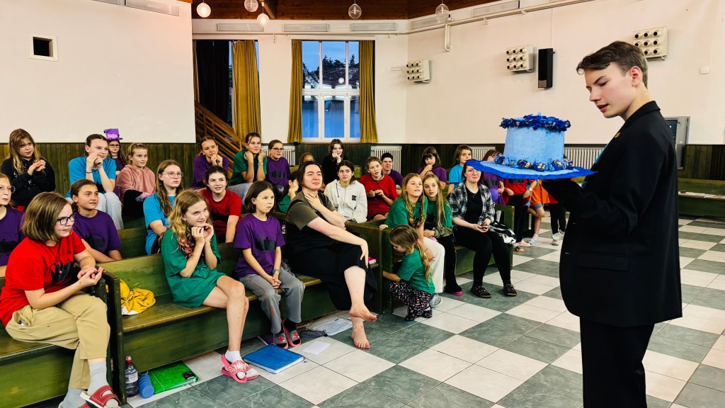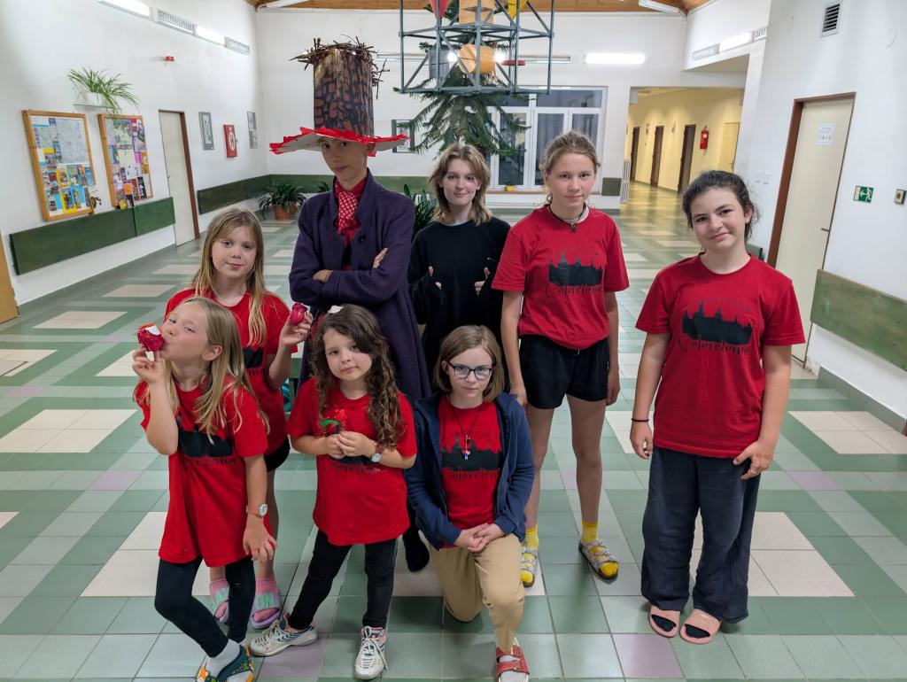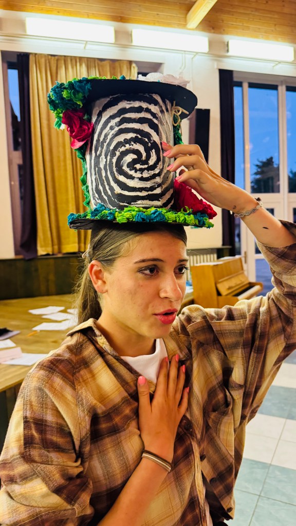 Odpoledne po zpívání jsme se sešli v aule, po průchodu dveřmi rámovanými barevnou plachtou jsme se ocitli v Říši divů, ovšem dveře se za námi zamkly a nemůžeme zpět do reálného světa, dokud nepřekonáme nástrahy a nezodpovíme hádanky, kterými nás Říše zkouší, a nezískáme klíč. Byla to vlastně taková nabombená únikovka (venku nám prší). Poté bylo úkolem v oddílu vyrobit klobouk pro deprimovaného Kloboučníka, který dočista ztratil inspiraci cokoliv tvořit. Do třetice všeho dobrého – sborové děti to opět vzaly velmi vážně, daly si opravdu záležet a poprosily si o čas navíc i po večeři.